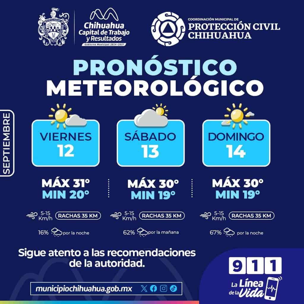 Chihuahua.– La Coordinación Municipal de Protección Civil, informa que para este fin de semana se prevén condiciones variables en la Capital, con incremento de nubosidad y probabilidad de lluvia en distintos momentos.