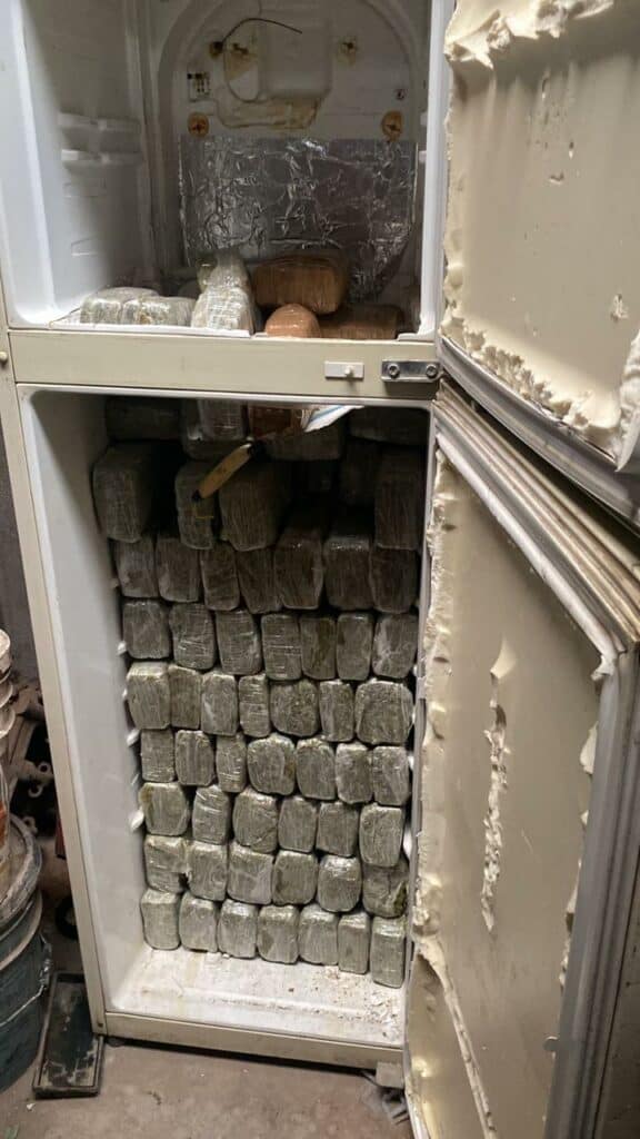 - Derivado de una orden de cateo para investigar el robo de un vehículo, el narcótico fue encontrado dentro de dos refrigeradores en la colonia Granjas Cerro Grande