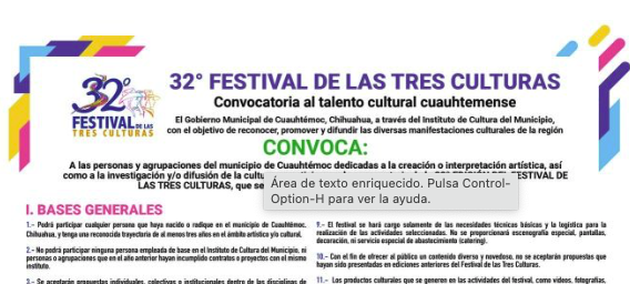 A las personas y agrupaciones del municipio de Cuauhtémoc dedicadas a la creación o interpretación artística, así como a la investigación y/o difusión de la cultura, a participar en la convocatoria de la 32o EDICIÓN DEL FESTIVAL DE LAS TRES CULTURAS, que se realizará entre el 16 de mayo y el 8 de junio de 2025.