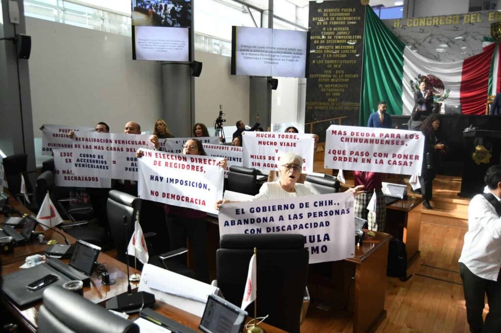 Con pancartas y carteles, los legisladores reclamaron que sectores enteros de Ciudad Juárez y Chihuahua capital carecen de agua potable y drenaje, denunciaron fallas y sobrecostos en la Torre y Plataforma Centinela, y señalaron que el transporte público sigue sin cubrir las necesidades de la población.