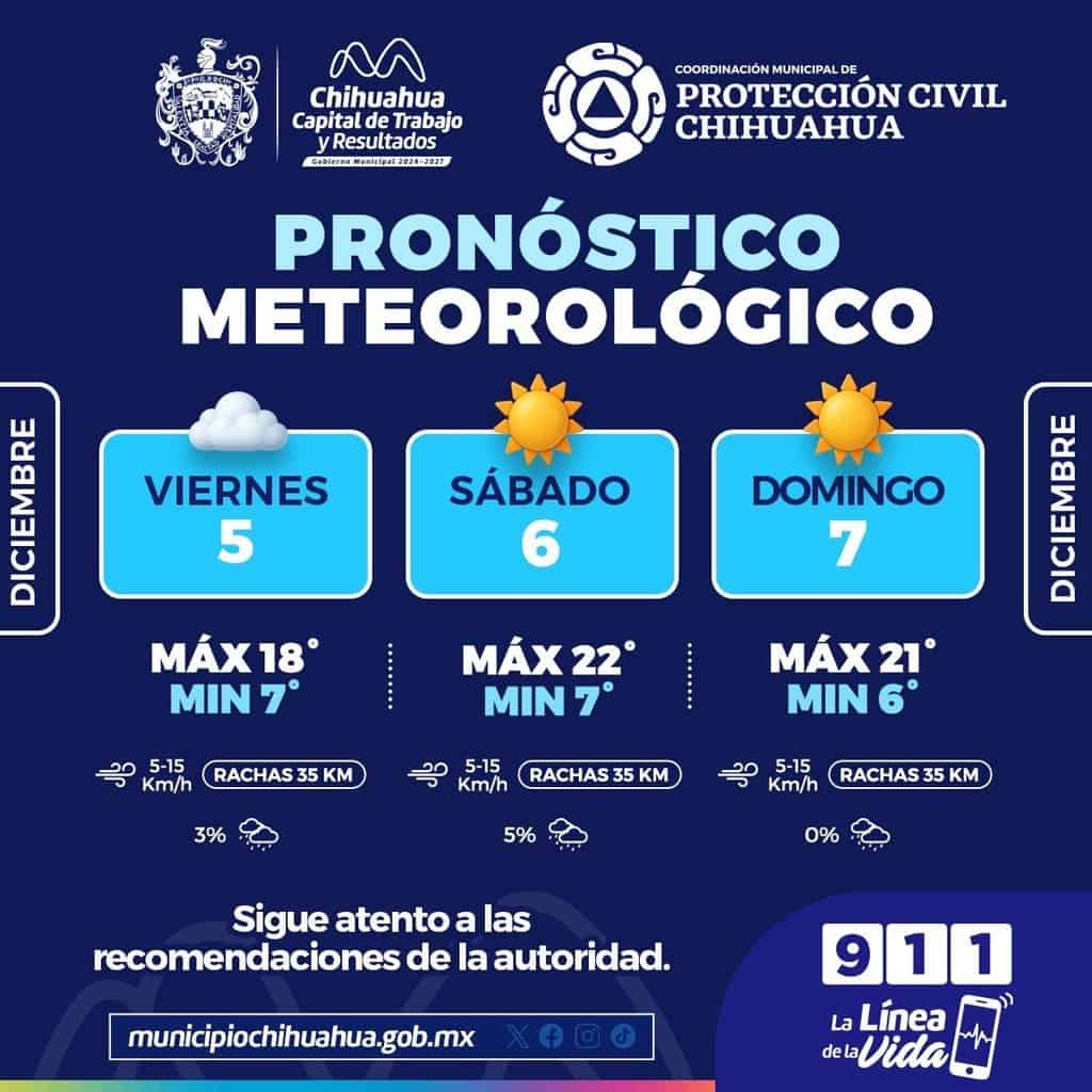 Chihuahua.- – La Coordinación Municipal de Protección Civil informa que este fin de semana, del 5 al 7 de diciembre, persistirán las temperaturas frías por las mañanas, con máximas moderadas durante el día.