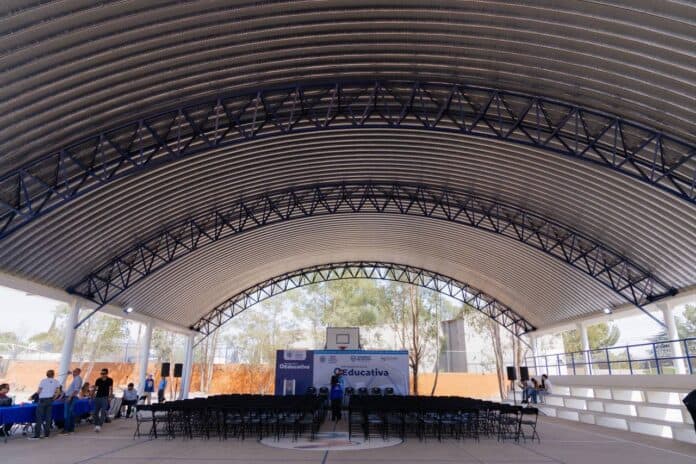 Chihuahua- El alcalde Marco Bonilla, inauguró un domo en la primaria Veteranos de la Revolución, de la colonia Veteranos, mismo que fue construido gracias al programa de Infraestructura Educativa, donde 153 alumnos se beneficiaron con esta techumbre que ayudará a que convivan y realicen deporte, protegiéndolos de las inclemencias del clima.