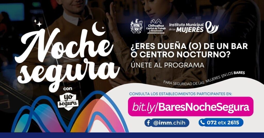 Chihuahua.- El Gobierno Municipal de Chihuahua, a través del Instituto Municipal de las Mujeres (IMM), invita a bares, restaurantes y centros nocturnos a formar parte del programa “Noche Segura”, una estrategia que promueve espacios libres de violencia y protocolos de actuación para proteger a mujeres en situaciones de acoso o peligro.