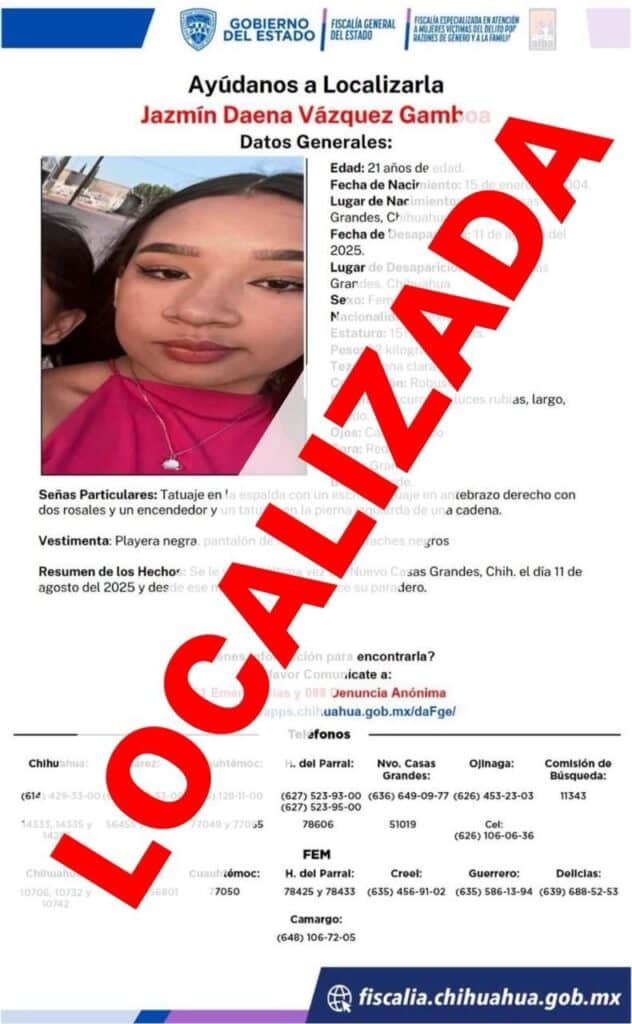 La Fiscalía Especializada en Atención a Mujeres Víctimas del Delito por Razones de Género y a la Familia en la Zona Noroeste, localizó sana y salva a Jazmín Daena V.G. de 21 años de edad, quien contaba con reporte de ausencia interpuesto este martes 19 de agosto.