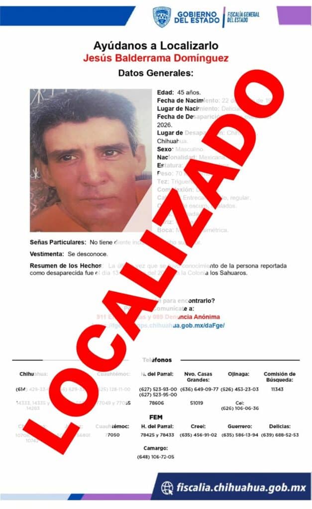 La Unidad de Investigación de Personas Ausentes y/o No Localizadas de la Fiscalía de Distrito Zona Centro (FDZC) encontró sano y salvo a Jesús B. D., de 45 años de edad, quien tenía reporte de ausencia interpuesto en la ciudad de Chihuahua.