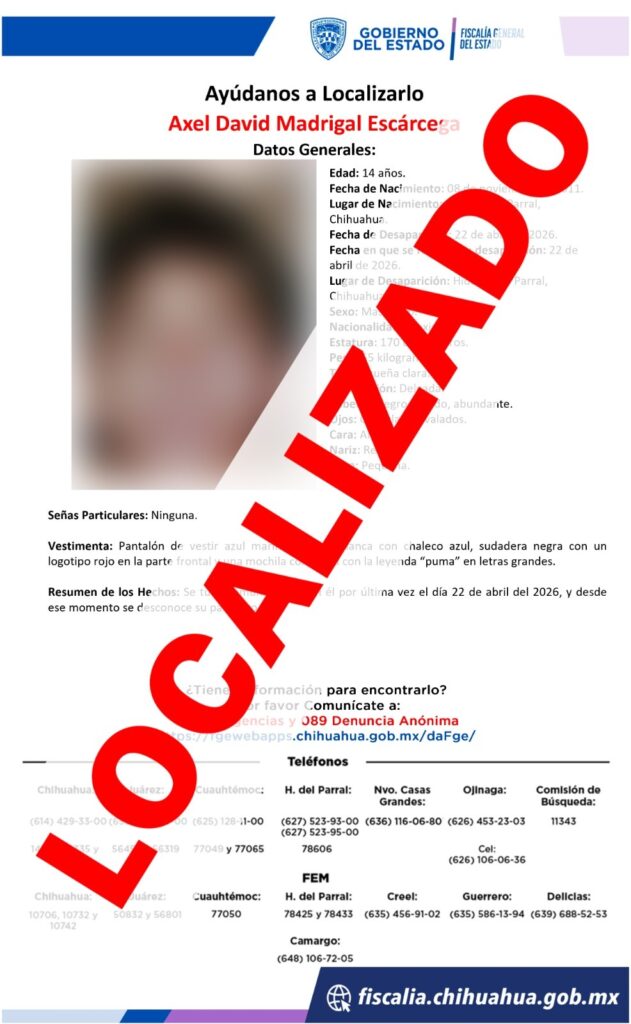 Como resultado de la implementación de protocolos de búsqueda coordinados por la Fiscalía de Distrito Zona Sur, logró localizar sano y salvo a un adolescente de 14 años de edad, reportado ausente ayer miércoles 22 de abril en la ciudad de Parral.