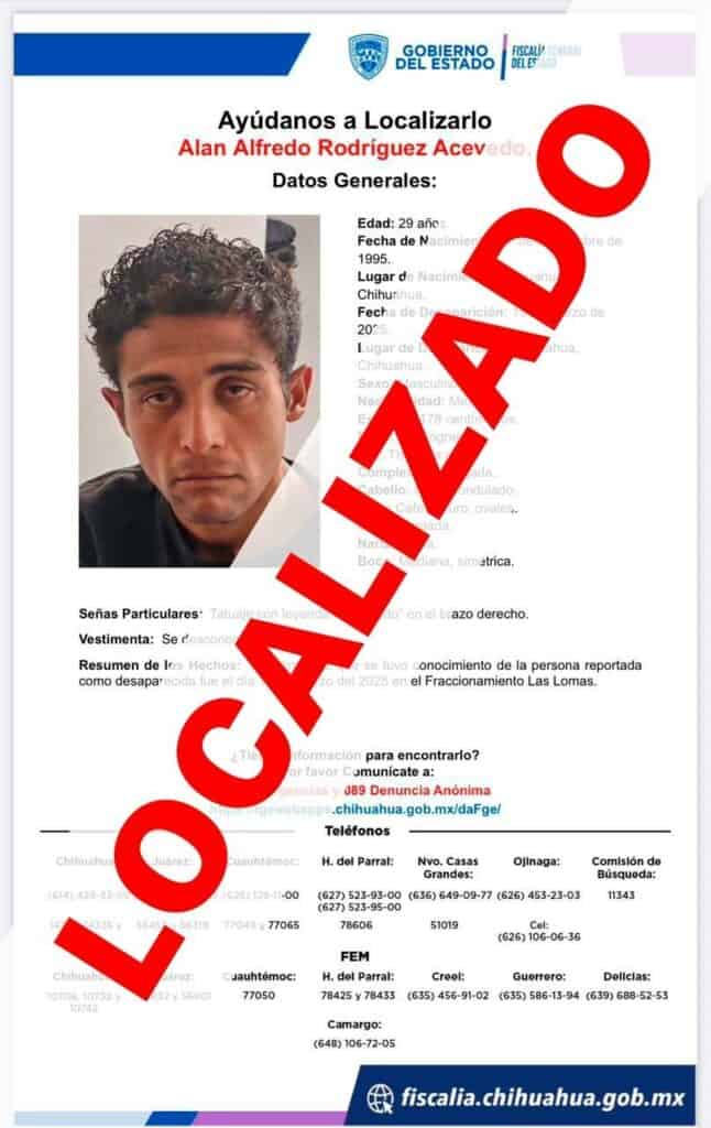 La Unidad de Investigación de Personas Ausentes y/o No Localizadas de la Fiscalía de Distrito Zona Centro, notificó la localización de un masculino de nombre Alan Alfredo R.A., quien contaba con reporte de ausencia interpuesto en la ciudad de Chihuahua.