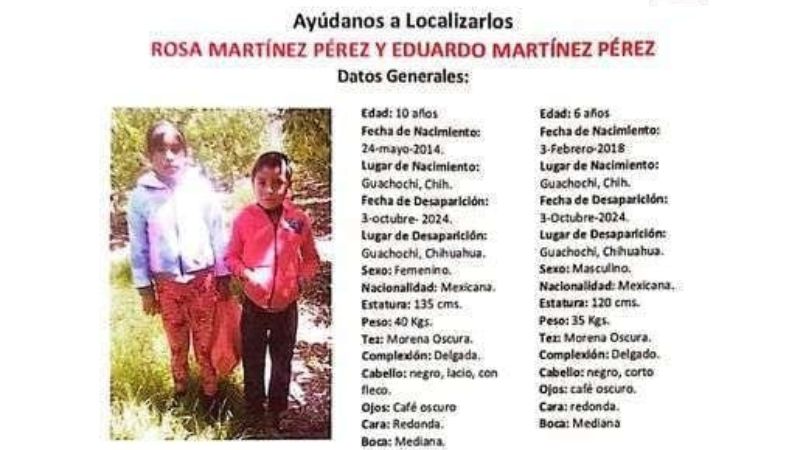 Los datos recabados en la investigación ministerial, establecen que los hermanitos Rosa y Eduardo Martínez Pérez, de 10 y 6 años de edad, fueron vistos por última vez el pasado 03 de agosto cuando se dirigían a la escuela en el citado municipio.