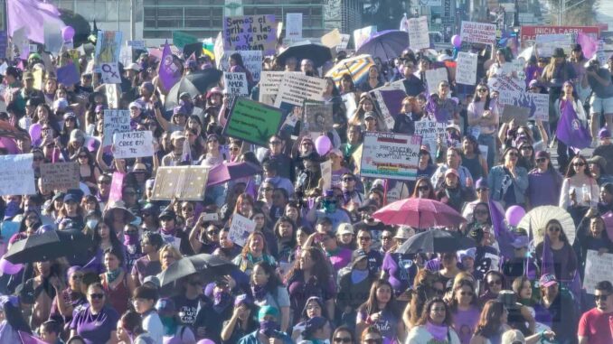 La marcha conmemorativa por el Día Internacional de la Mujer avanzó desde la estatua de Pancho Villa hacia el centro de la ciudad, concentrando a un numeroso contingente que recorrió avenidas principales hasta llegar al primer cuadro de la capital. Conforme el grupo se aproximó a la Plaza del Ángel, la manifestación adquirió mayor intensidad, con consignas y expresiones de protesta que resonaron entre las calles.
