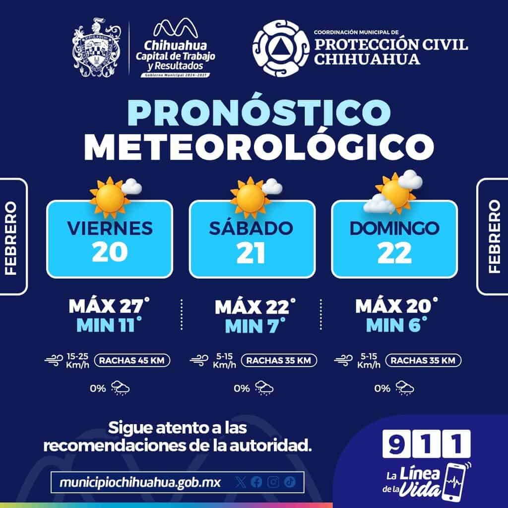 Chihuahua – La Coordinación Municipal de Protección Civil informa que para este fin de semana se prevén condiciones mayormente estables en la capital del estado, con temperaturas cálidas por las tardes y frescas por la mañana.