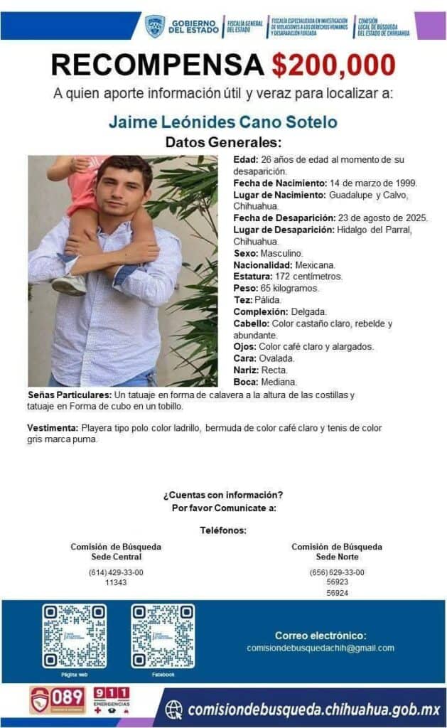 La Comisión Local de Búsqueda, en coordinación con la Fiscalía de Distrito Zona Sur, ofrece recompensa de 200 mil pesos a quien proporcione información veraz, útil y comprobable, que contribuya a la localización de Jesús Gerónimo Sánchez Tarín y otros 200 mil pesos, por información para encontrar a Jaime Leónides Cano Sotelo, quienes fueron reportados como desaparecidos el 23 de agosto de 2025, en la ciudad de Parral. Desde el momento en que se tuvo conocimiento de los hechos, esta representación social ha desplegado diversas acciones de búsqueda e investigación, entre las que destacan rastreos en campo, entrevistas, pega de pesquisas, elaboración y difusión de cédulas de identificación, así como la cumplimentación de órdenes de cateo, con el objetivo de dar con el paradero de las personas mencionadas. En tanto, la Fiscalía de Distrito Zona Sur mantiene los trabajos de investigación bajo los principios de debida diligencia, enfoque de derechos humanos y coordinación interinstitucional, al tiempo que hacen un llamado a la sociedad para colaborar con cualquier información que pueda resultar relevante. Si cuenta con datos que permitan la localización de Jesús Gerónimo Sánchez Tarín y Jaime Leónides Cano Sotelo, o de otras personas con estatus de no localización y/o desaparición, favor de comunicarse al 614) 429-33-00, extensión 11343, (656) 629-33-00, extensiones 56923 y 56924, 911 para atención inmediata, o bien, al 089 para Denuncia Anónima, toda la información proporcionada será tratada con estricta confidencialidad. Con estas acciones, la Fiscalía General del Estado reitera su compromiso de trabajar de manera permanente y coordinada en la búsqueda y localización de personas, a fin de brindar certeza y tranquilidad a las familias.