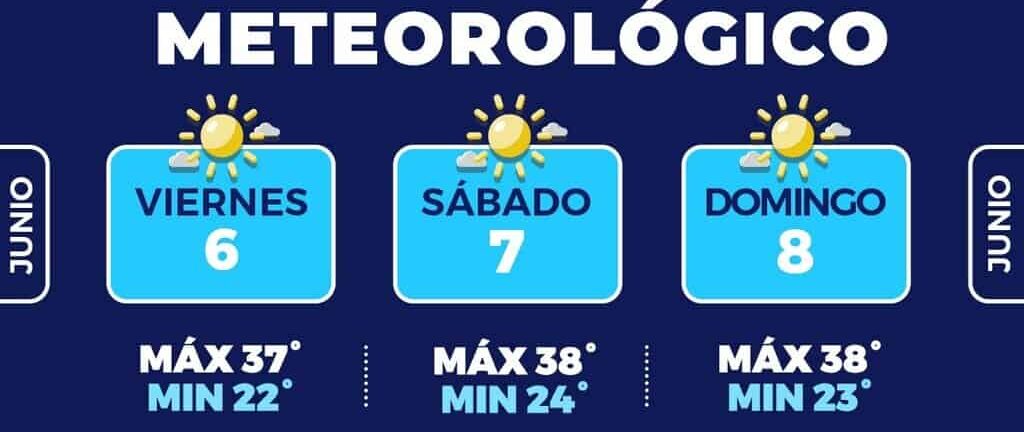 • Finalmente, el domingo el termómetro podría alcanzar los 38°C, con una mínima de 23°C y condiciones de cielo mayormente soleado. Así como un 20 por ciento de probabilidad de lluvia.