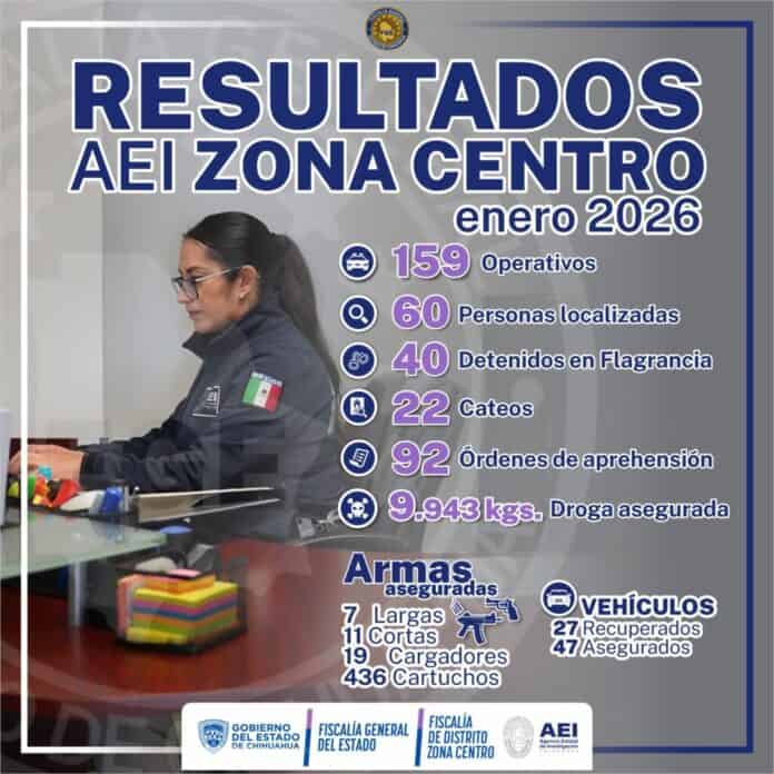 Personal de la Agencia Estatal de Investigación, adscrito a la Fiscalía de Distrito Zona Centro, realizó 159 operativos durante enero de 2026 en los 19 municipios que comprende la jurisdicción.