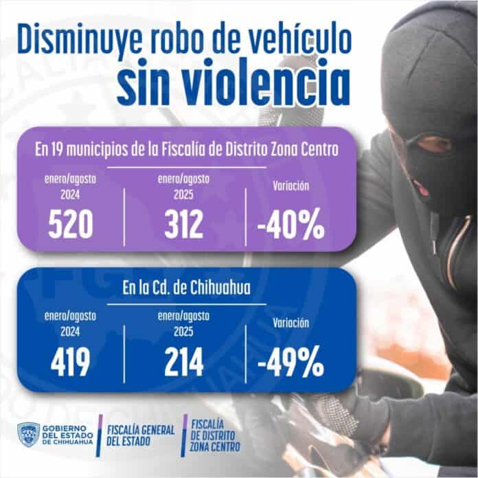 Durante los primeros siete meses del año 2025, el robo de vehículos sin violencia disminuyó 40 por ciento, en los 19 municipios que comprende la jurisdicción de la Fiscalía de Distrito Zona Centro, solo en la ciudad de Chihuahua, este delito bajo 49 por ciento.