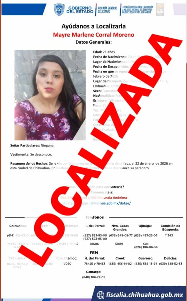 La Unidad Especializada en la Búsqueda y Localización de Mujeres Ausentes o no Localizadas de la Fiscalía Especializada en Atención de Mujeres Víctimas del Delito por Razones de Género y a la Familia (FEM), dio a conocer la localización de Mayre Marlene C. M., quien contaba con reporte de ausencia desde el día primero de febrero.
