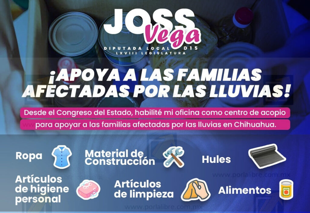 Chihuahua.- La diputada por el Partido Acción Nacional (PAN), Joceline ‘Joss’ Vega dio a conocer que su oficina, ubicada en el piso 10 del Congreso del Estado, estará habilitada como centro de acopio para apoyar a las personas que resultaron damnificadas por las lluvias que han azotado a la capital durante esta semana.